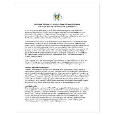 DownloadST. LOUIS – (BUSINESS WIRE) – 21 August 2017: Build-A-Bear Workshop, Inc. (NYSE:BBW) today announced that its Board of Directors has completed its previously announced review of strategic alternatives.