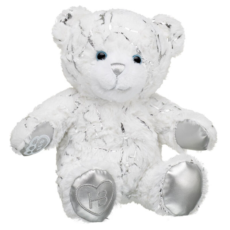 Time to Shine Bear features silver paw pads and sparkly accents on its white fur.